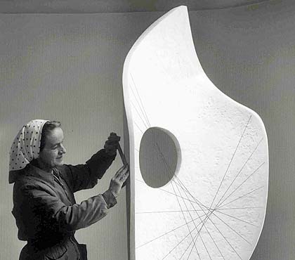 Barbara Hepworth holding a file with the plaster for Curved Form (Bryher II) (November 1961) © Bowness, Hepworth Estate
